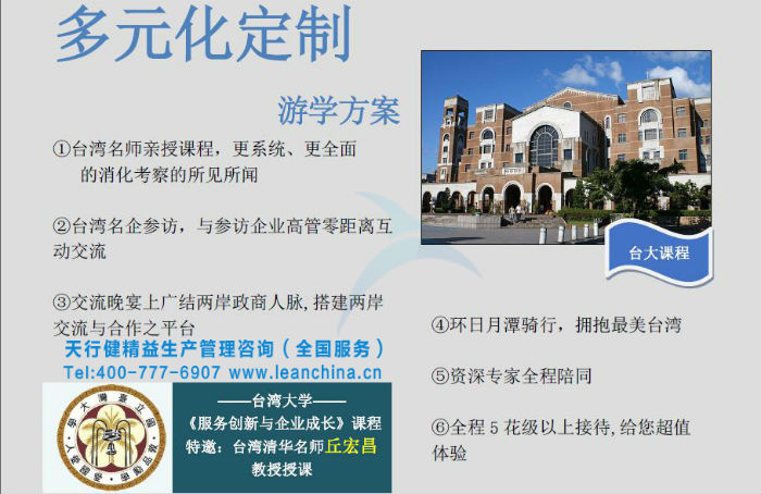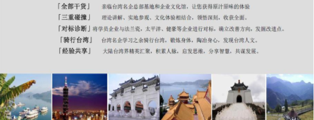 除了在臺灣知名大學(xué)參加培訓(xùn)課程之外,我們的臺灣游學(xué)項(xiàng)目,還為各位企業(yè)家和經(jīng)營提供了走進(jìn)臺灣著名企業(yè)的機(jī)會、近距離和他們溝通交流,了解企業(yè)文化,學(xué)習(xí)管理經(jīng)驗(yàn),為渴求在臺灣知名企業(yè)中獲得啟迪的企業(yè)家提供了近距離接觸的機(jī)會。