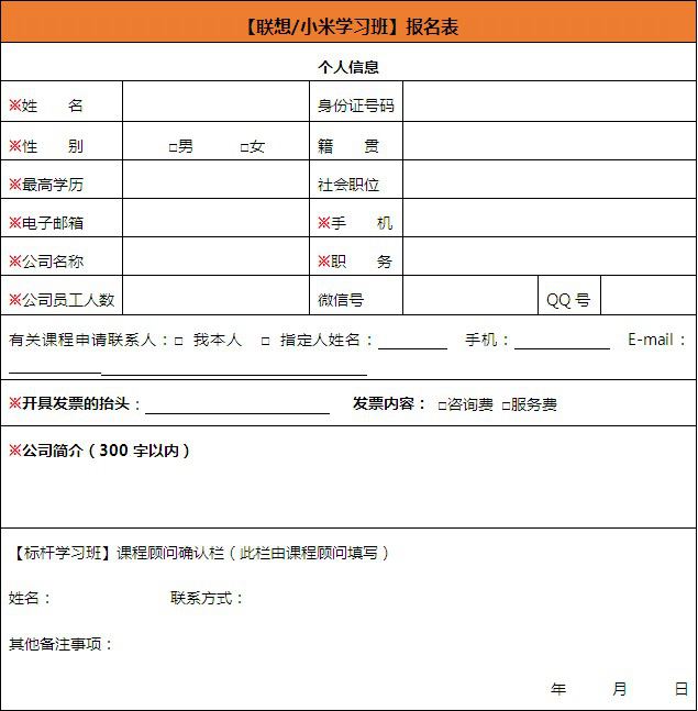 填表說(shuō)明:為確保您第一時(shí)間了解到最新課程信息,保障您的權(quán)益,請(qǐng)您務(wù)必詳細(xì)、準(zhǔn)確填寫(xiě)報(bào)名表內(nèi)容。本報(bào)名表將嚴(yán)格作為內(nèi)部存檔,不會(huì)泄露您的個(gè)人信息。